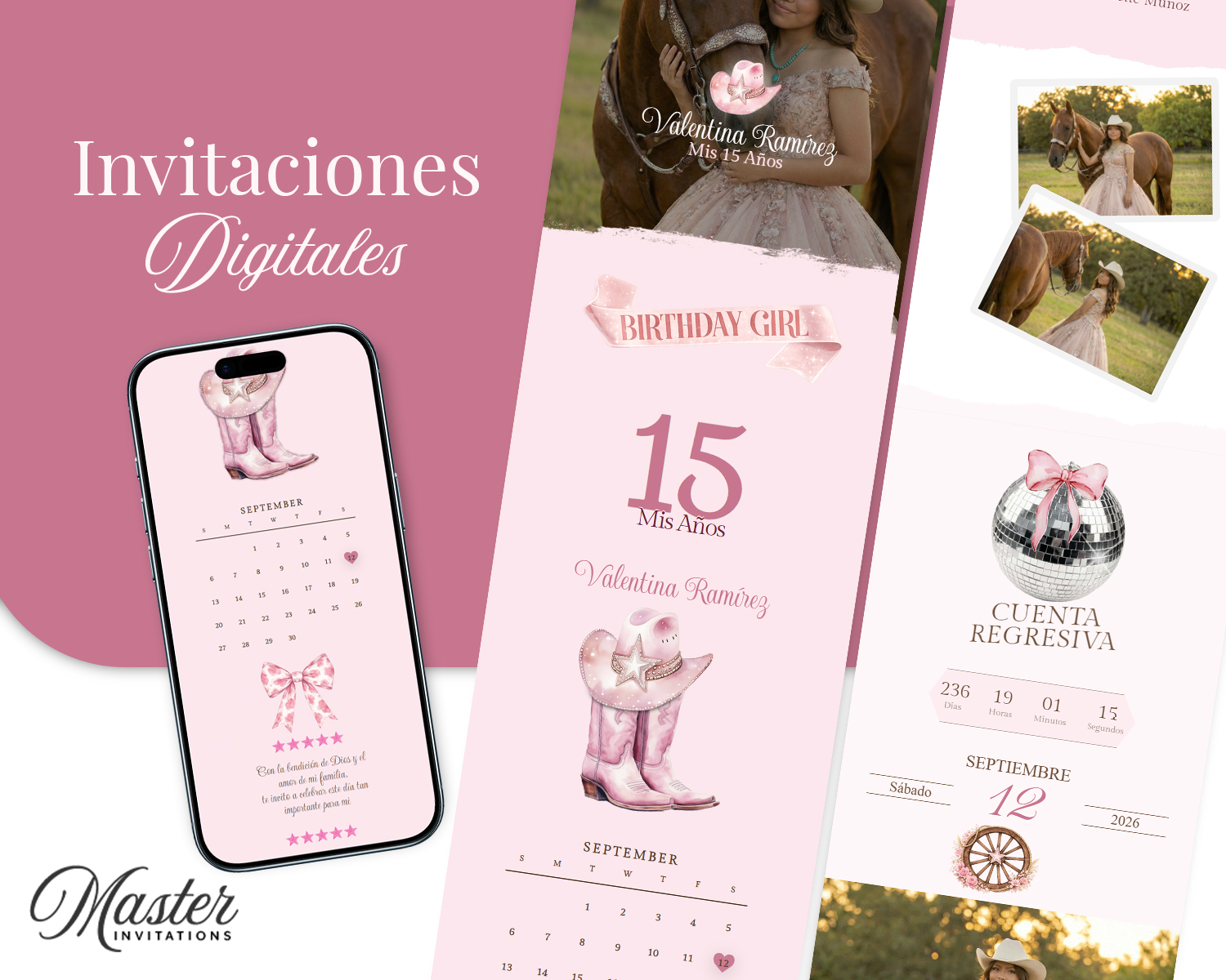 Invitación digital para XV años con estilo cowgirl elegante. Incluye galería de 6 fotos, música de fondo, ubicación, itinerario, contador regresivo y confirmación de asistencia.